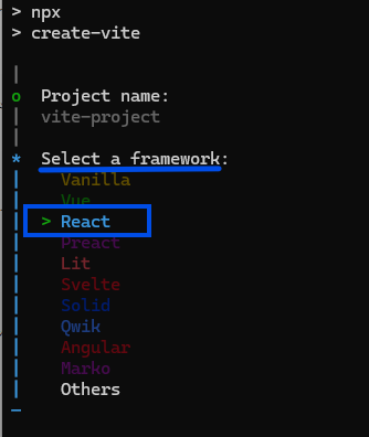次に、「Select a framework:」でReactを選択し、Enterを押下。