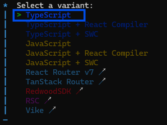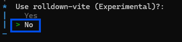 次に、「Use rolldown-vite (Experimental)?:」と聞かれたら、「No」を選択しEnterを押下。