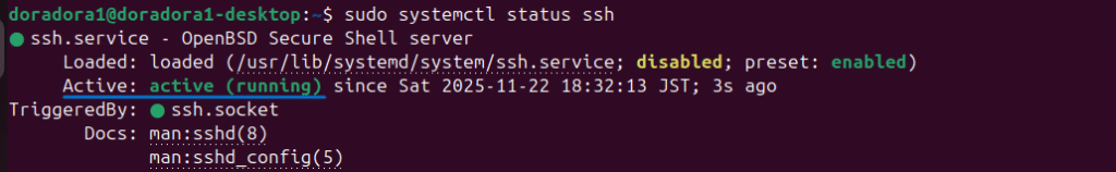 sudo systemctl start sshもう一度サービスを確認します。