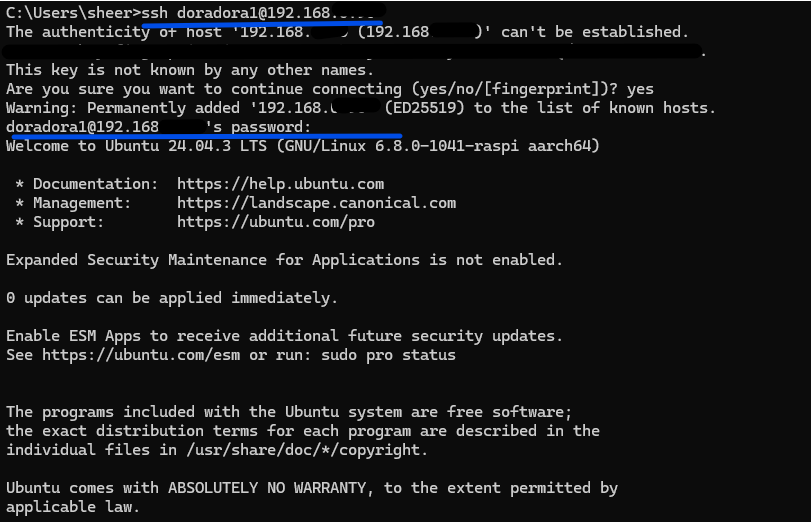 ssh [ユーザー名]@[UbuntuのIPアドレス]例)ssh doradora1@192.1680.0.1