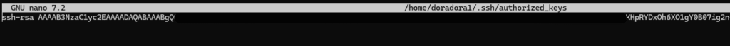 sudo nano ~/.ssh/authorized_keysid_rsa.pubの内容を張り付けます。「ctrl」+「S」で保存し、「Ctrl」+「X」でファイル編集を終了します。